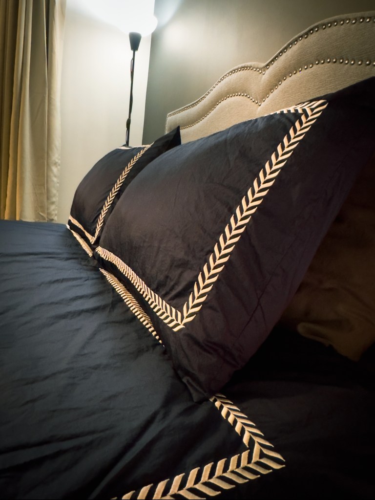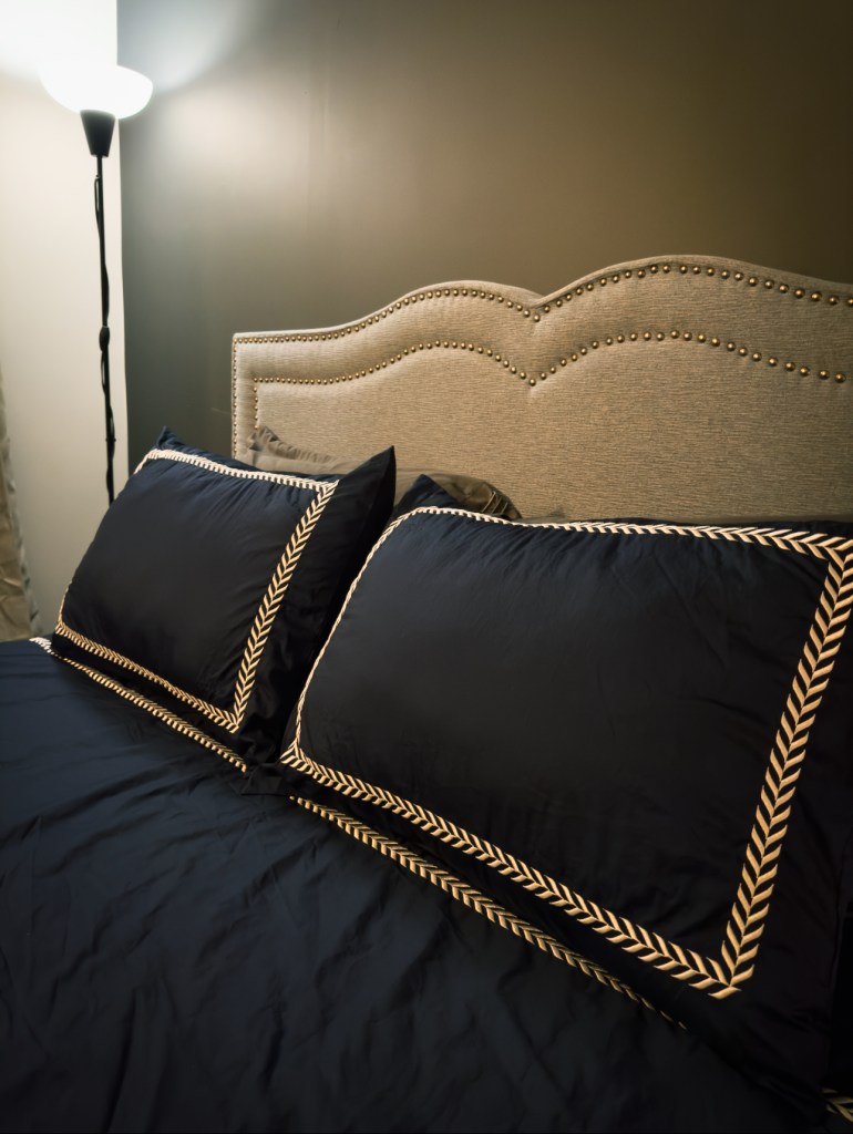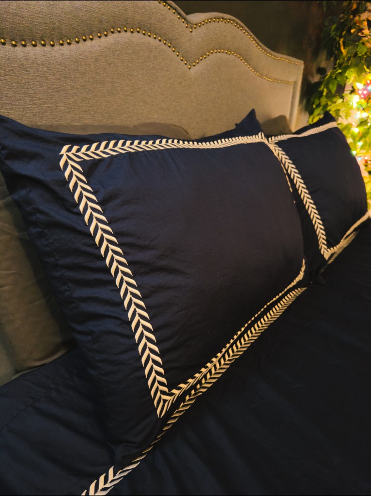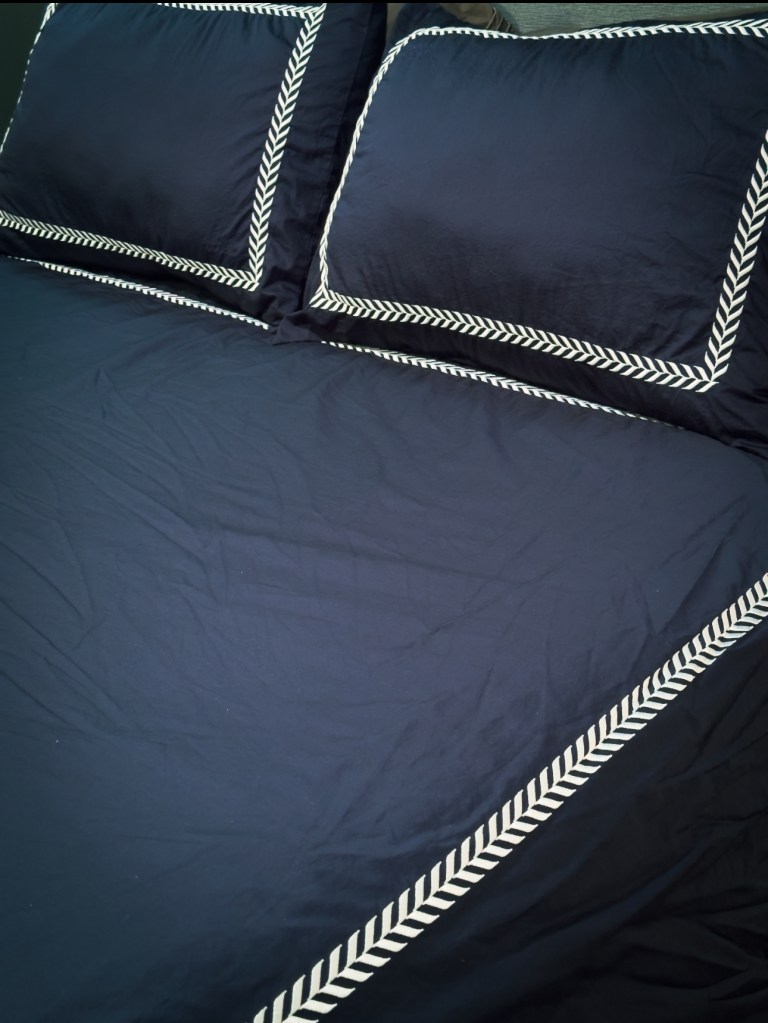 I’m absolutely obsessed with the navy blue colour. It adds to the moody vibe I’m going for in our bedroom. Our bedroom decor is not complete as yet but this set has elevated it so much. It’s giving luxurious hotel bedding and I’m here for it.